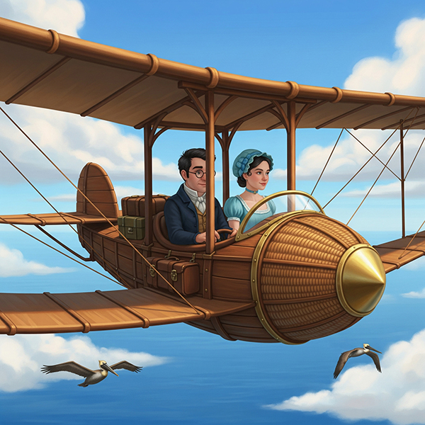 "Well, Jack; we'll be off now," muttered Stephen darkly, his pale countenance belying the dread that welled up unbidden — sweat dotting his forehead, a knot in the pit of his stomach — as he contemplated with intense distrust the gleaming form of the gliding-machine. Killick had spent two and a half delightful hours with rags, wax, spit and spot remover; polishing the wooden struts and what little bright-work was to be seen, repairing the wicker with new canes he'd kept stashed away in his private mending-kit these many years, and removing stains from the stretched linen wing-covering. He stood proudly by as the Stephen and Diana took their places in the cockpit, beaming at his handiwork and fussing, "Now, Doctor, easy with them d__n boots: mind you don't mark the woodwork. Oh, oh..."