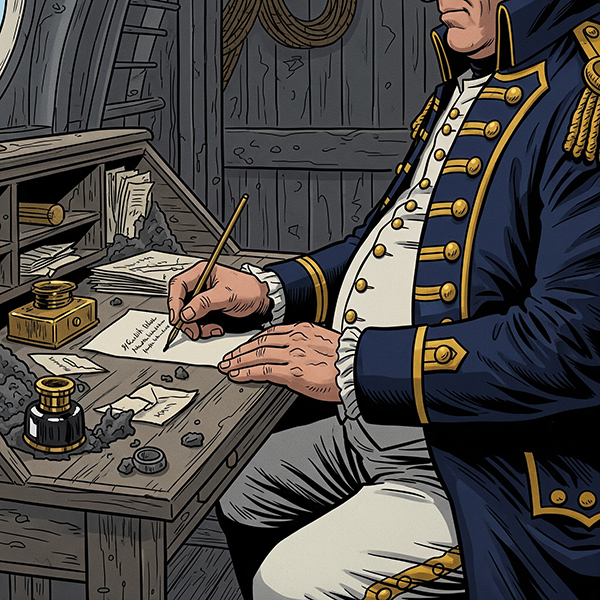 "Sail ho!" cried the lookout, and Jack Aubrey was instantly on deck, fully awake, completely dressed, his heavy double-gilt epaulettes gleaming under the fresh coat of shellac Killick had applied while he slept, his boots gleaming, the red ribbon of the Bath dangling precisely across his brawny chest. Only the chartreuse sleeping cap adorned with Superman action figures, which he had neglected to remove, betrayed that he had not been on-deck for over an hour.
