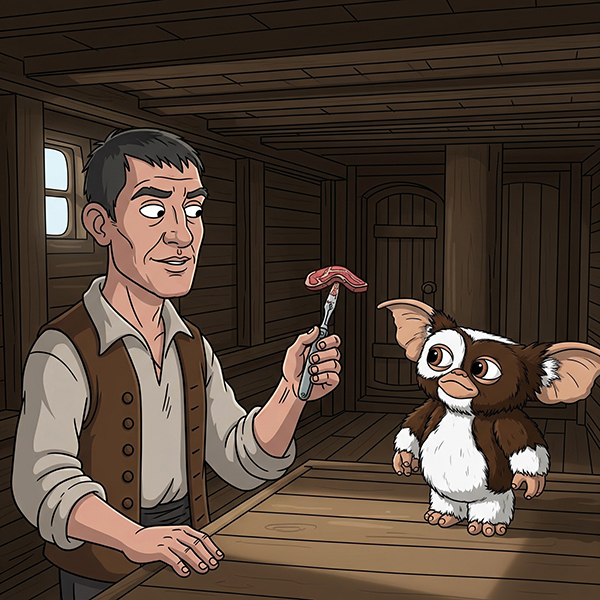 Jack yawned, stretched and said, "I think I shall turn in; it's past eight bells". He glanced at the Mogwai. It was now eagerly devouring the slice of meat that Stephen held towards it on the point of a lancet. "Uncommon appealing creature, ain't it?"